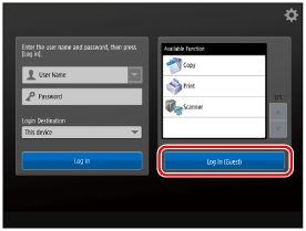 The [GuestUser] role (guest role) can be edited. For more information, see "Editing the [GuestUser] Role (Guest Role)." If you select [Allow unregistered users to log in as Guest User] when Device Level Log-in is selected as the login method, a login screen similar to the following is displayed on the touch panel display of the device. When unregistered users log in, they press [Log In (Guest)], without entering a user name and password. The functions that unregistered users can use are set in the usage restriction information of the [GuestUser] role. ![]() |
