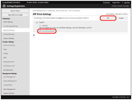 If IPP printing settings are enabled, you can specify [Use Authentication]. |