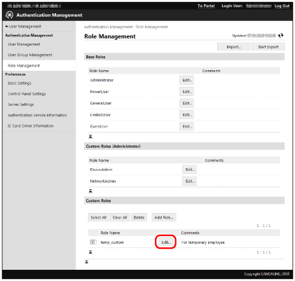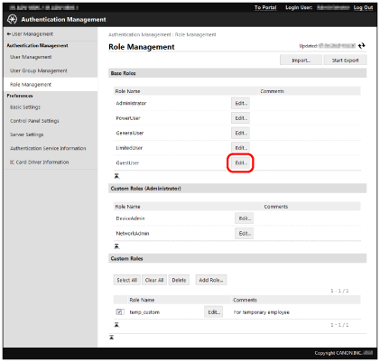 Only [Comments] can be edited for base roles and custom roles (administrator). Restriction information can also be edited for the [GuestUser] role. For more information, see "Editing the [GuestUser] Role (Guest Role)."