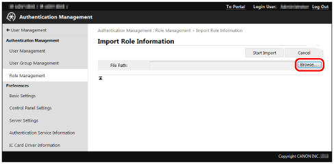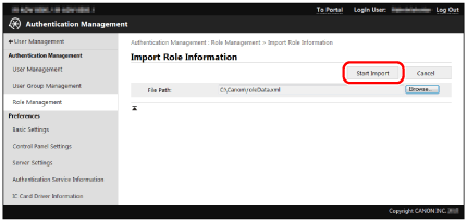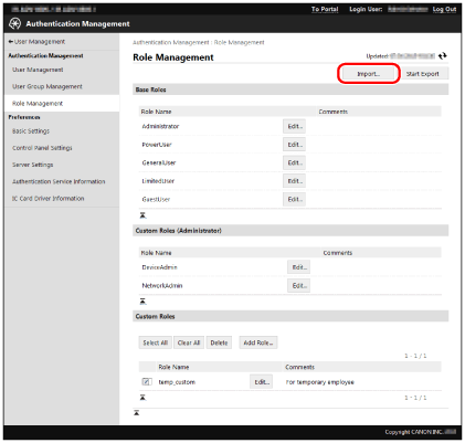 If roles not included in the import file were registered in the device, those roles are not deleted, and the roles inside the import file are added to the device.
