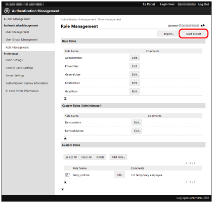 It is recommended you export role information after creating custom roles, for backup purposes. Since exported roles can be imported in other devices, the custom roles you create can also be registered in multiple devices. For more information, see "Importing Roles" and see "Exporting Roles."