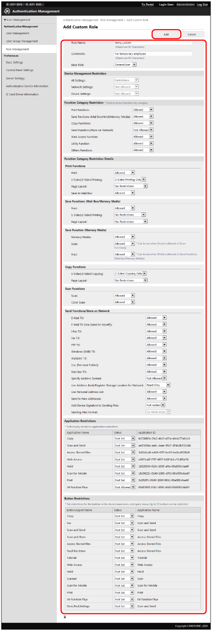 (Even if both [Device Settings] and [Network Settings] are set to [No Restrictions], privileges equivalent to the [Administrator] role are not available for the device management privileges.)