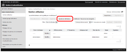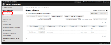 Cliquer sur [Réglages/Enregistrement] → [Gestion utilisateur] → [Gestion de l'authentification] → [Gestion utilisateur].