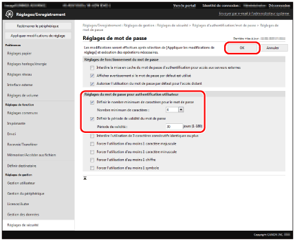 Définir la stratégie de mot de passe sous [Réglages du mot de passe pour authentification utilisateur].