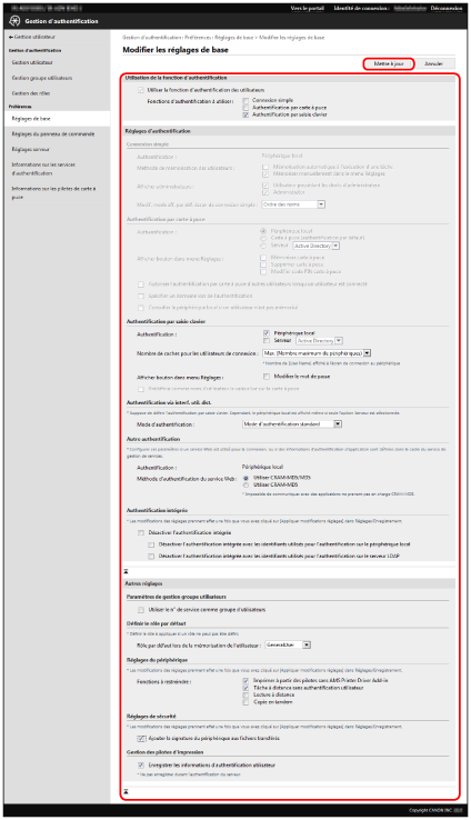 Cliquer sur [Réglages/Enregistrement] → [Gestion utilisateur] → [Gestion de l'authentification] → [Réglages de base].