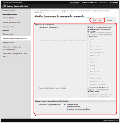 Cliquer sur [Réglages/Enregistrement] → [Gestion utilisateur] → [Gestion de l'authentification] → [Réglages du panneau de commande].