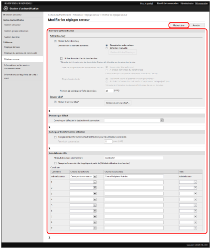 Cliquer sur [Réglages/Enregistrement] → [Gestion utilisateur] → [Gestion de l'authentification] → [Réglages serveur].