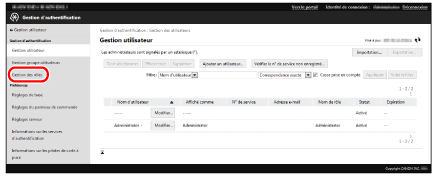 Lorsque l'on crée des rôles personnalisés, il est recommandé de les exporter afin de les sauvegarder. Comme les rôles exportés peuvent être importés depuis d'autres périphériques, les rôles personnalisés que l'on crée peuvent être enregistrés sur plusieurs périphériques. Pour plus d'informations, se reporter à « Importation des rôles » et à « Exportation de rôles ». Attribuer des rôles aux utilisateurs par le biais de l'écran [Gestion utilisateur]. Pour plus d'informations, se reporter aux manuels d'instructions du périphérique. |