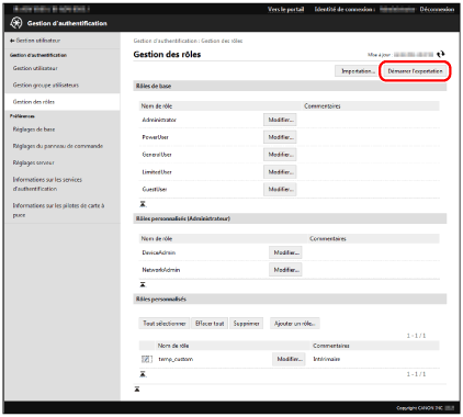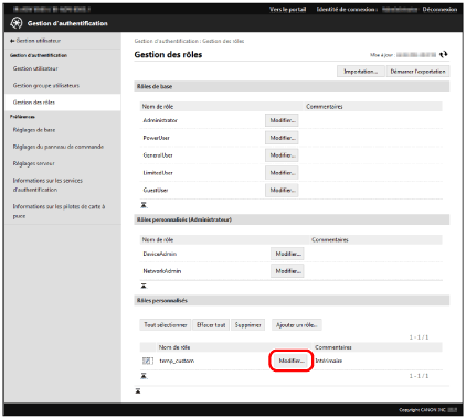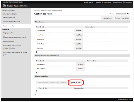 Lorsque l'on modifie des rôles personnalisés, il est recommandé de les exporter afin de les sauvegarder. Pour plus d'informations, voir « Exportation de rôles ». Attribuer des rôles aux utilisateurs par le biais de l'écran [Gestion utilisateur]. Pour plus d'informations, se reporter aux manuels d'instructions du périphérique. |