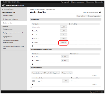 Lorsque l'on modifie le rôle [GuestUser], il est recommandé d'exporter les paramètres de rôles afin de les sauvegarder. Pour plus d'informations, voir « Exportation de rôles ». |