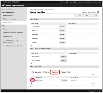 Les rôles de base et les rôles personnalisés (administrateur) ne peuvent pas être supprimés. |