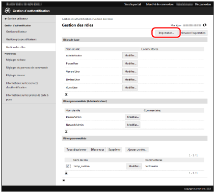 Si l'on importe un rôle portant le même nom qu'un rôle déjà présent sur le périphérique, les paramètres du rôle existant sont remplacés par ceux du rôle importé. Pour tous les rôles de base, à l'exception du rôle d'invité, et tous les rôles personnalisés (administrateur), seuls les commentaires sont remplacés. Si le réglage [Restriction de gestion de périphérique] n'est pas valide (si [Réglages du périphérique] et [Réglages réseau] sont fixés sur [Non autorisé] alors que [Tous les paramètres] est fixé sur [Pas de restrictions]), les paramètres de rôles sont considérés comme incorrects et ne sont pas importés. Les rôles enregistrés sur le périphérique qui ne figurent pas dans le fichier d'importation ne sont pas supprimés ; les rôles définis dans le fichier d'importation sont chargés sur le périphérique. |