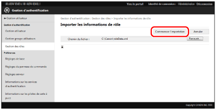 Si l'importation des paramètres de rôles échoue, les données initiales (celles présentes sur le périphérique avant l'opération d'importation) sont restaurées. |