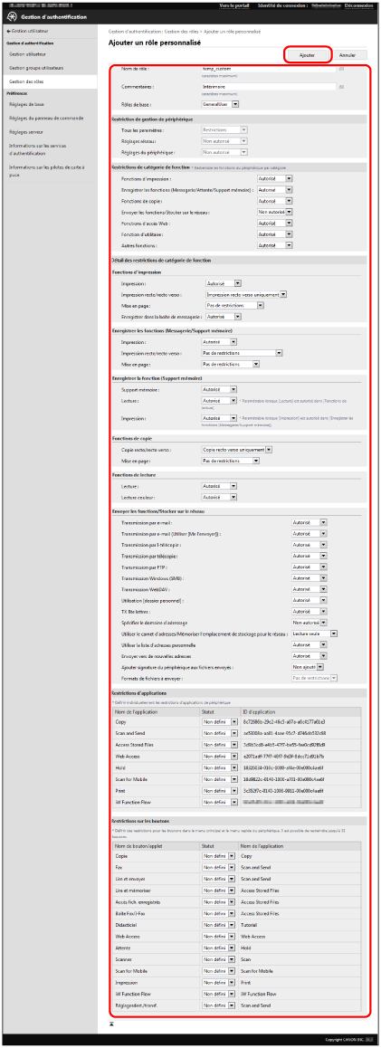 [Restriction de gestion de périphérique] | Définir les restrictions sur les privilèges de gestion de périphérique. [Tous les paramètres]: Si l'on règle ce paramètre sur [Pas de restrictions], les privilèges de gestion de périphérique ne font l'objet d'aucune restriction, et ce quels que soient les réglages définis sous [Réglages du périphérique] et [Réglages réseau]. (Les privilèges de gestion de périphérique correspondent à ceux du rôle [Administrator].) Si l'on règle ce paramètre sur [Restrictions], les privilèges de gestion de périphérique sont limités en fonction des réglages définis sous [Réglages du périphérique] et [Réglages réseau]. (Même si [Réglages du périphérique] et [Réglages réseau] sont tous les deux réglés sur [Pas de restrictions], les privilèges de gestion de périphérique ne correspondent pas à ceux du rôle [Administrator].) [Réglages réseau]: Sélectionner [Pas de restrictions]/[Non autorisé] pour les privilèges de gestion de périphérique de chacune des catégories de réglages réseau. [Réglages du périphérique]: Sélectionner [Pas de restrictions]/[Non autorisé] pour les privilèges de gestion de périphérique de chacune des catégories de réglages de périphérique. | Il est possible de définir si [Administrator] est réglé pour [Rôles de base]. |