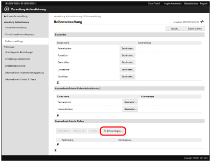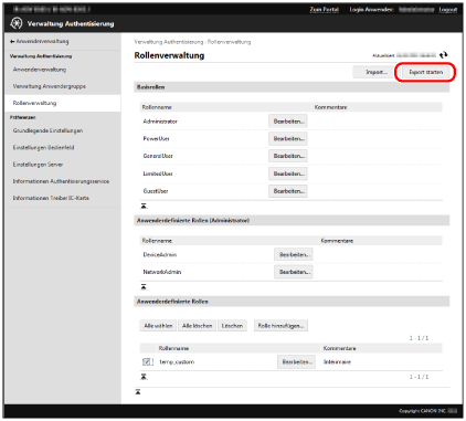Es wird empfohlen, die Rollendaten nach Erstellen der benutzerdefinierten Rollen zu Sicherungszwecken zu exportieren. Da exportierte Rollen in andere Geräte importiert werden können, können die von Ihnen erstellten benutzerdefinierten Rollen auch in mehreren Geräten registriert werden. Nähere Informationen dazu finden Sie in den Abschnitten "Importieren von Rollen" und "Exportieren von Rollen". Verknüpfen Sie Rollen mit Benutzern auf dem Bildschirm [Anwenderverwaltung]. Nähere Informationen dazu finden Sie in den Bedienungsanleitungen zu dem Gerät. |