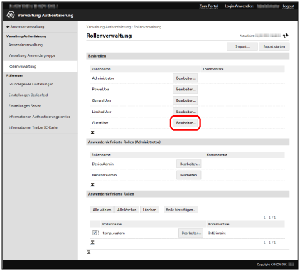Es wird empfohlen, die Rollendaten nach Bearbeiten der Rolle [GuestUser] zu Sicherungszwecken zu exportieren. Weitere Informationen dazu finden Sie unter "Exportieren von Rollen". |