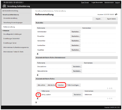 Basisrollen und benutzerdefinierte Rollen (Administrator) können nicht gelöscht werden. |