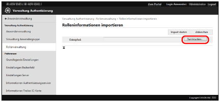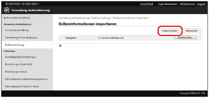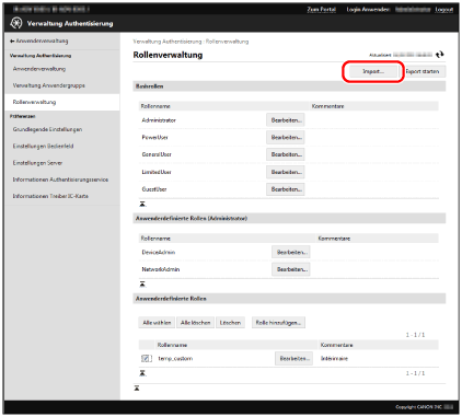 Wenn eine Rolle mit dem Namen der zu importierenden Rolle schon existiert, wird die vorhandene Rolle mit den Daten der importierten Rolle überschrieben. Es werden allerdings nur Kommentare für andere Basisrollen als die Gastrolle und benutzerdefinierte Rollen (Administrator) überschrieben. Wenn die Einstellung [Beschränkung Geräteverwaltung] ungültig ist (wenn [Einstellungen Gerät] und [Einstellungen Netzwerk] auf [Nicht zugelassen] gesetzt sind, obwohl [Alle Einstellungen] auf [Keine Beschränkungen] gesetzt ist), sind die Rollendaten ungültig und werden nicht importiert. Wenn nicht in der Importdatei enthaltene Rollen im Gerät gespeichert wurden, werden diese Rollen nicht gelöscht, und die Rollen in der Importdatei werden dem Gerät hinzugefügt. |