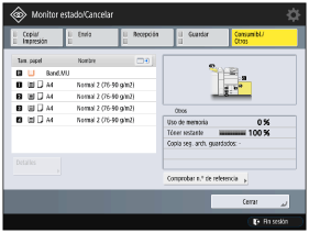 Para obtener más información sobre la pantalla [Monitor estado/Cancelar], consulte los manuales de instrucciones del dispositivo. |