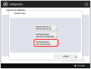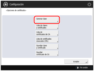 (Configuración) → [Opciones de gestión] → [Gestión del dispositivo] → [Opciones de certificado] → [Generar clave].