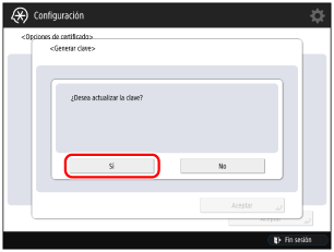 El par de claves se actualizará una vez reiniciado el dispositivo. Para obtener información sobre cómo reiniciar el dispositivo, consulte los manuales de instrucciones del dispositivo. |