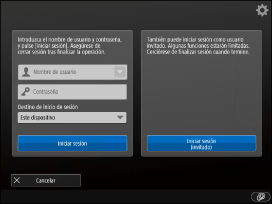 Si un usuario no registrado está utilizando el dispositivo y pulsa [Iniciar sesión (invitado)] sin introducir un nombre de usuario y una contraseña, solo podrá ver en la pantalla táctil las funciones que no están restringidas.