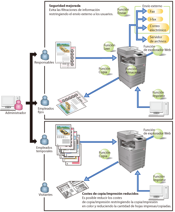 La restricción de funciones relacionadas con la copia o la impresión, como la de salida en color, salida a una cara y formato de página para cada usuario, permite reducir el coste de uso de los dispositivos.