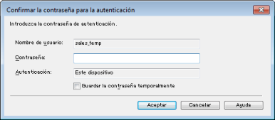 Si se han configurado los equipos cliente, se abrirá el cuadro de diálogo [Confirmar la contraseña para la autenticación] cuando los usuarios impriman desde un ordenador.