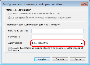 [Método de configuración] se activa al iniciar sesión en el ordenador como usuario de dominio en un entorno que utiliza la autenticación de Active Directory. De lo contrario, se selecciona [La configuración ha autenticado la información del usuario]. |