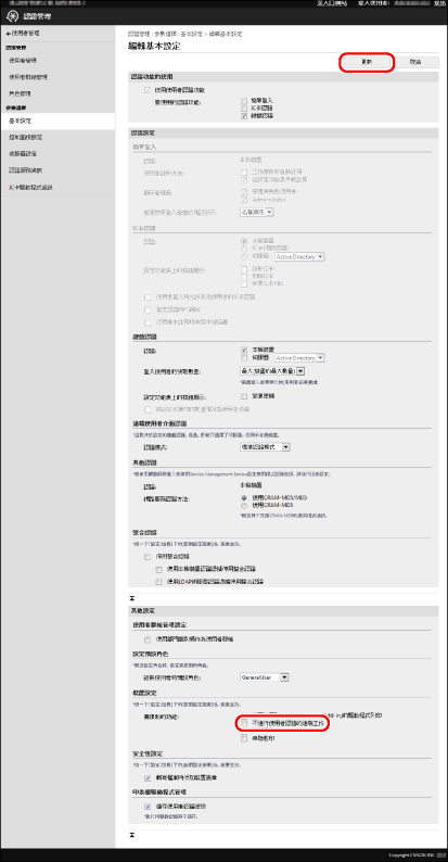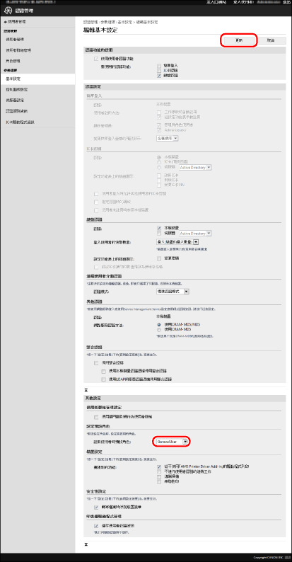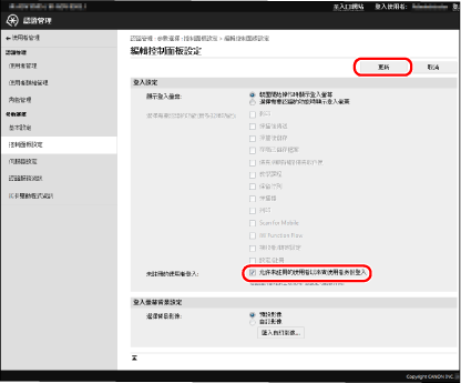 如果選擇「功能層級登入」,則在建立/編輯自訂角色及編輯來賓角色時應特別小心,確保套用至已註冊使用者的限制不會比套用至未註冊使用者的限制更嚴格。如果套用至已註冊使用者的限制比套用至未註冊使用者的限制更嚴格,則登入後可使用的功能數量將會比登入前少,而導致不適當的使用者管理。 |