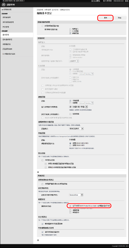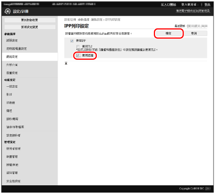 如果啟用 IPP 列印設定,您可指定 [使用認證]。 |
