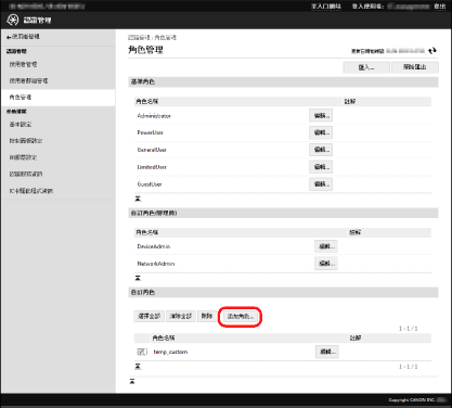 按一下 [設定/註冊] → [使用者管理] → [認證管理] → [角色管理]。