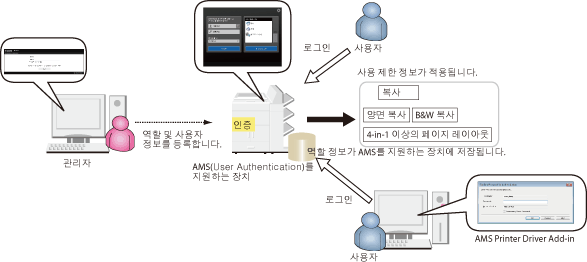 로컬 장치 인증 | 장치에서 사용자 정보 관리 및 사용자 인증을 수행합니다. 사용자가 사용자 이름과 암호를 장치에 입력하면 장치에 등록된 로컬 사용자 정보에 기초해 사용자 인증이 수행됩니다. |
