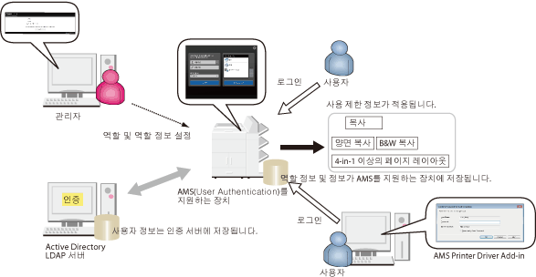 로컬 장치 인증 + Active Directory 인증 또는 로컬 장치 인증 + LDAP 인증 | 이러한 사용자 인증 방법은 Active Directory 인증과 로컬 장치 인증 또는 LDAP 인증과 로컬 장치 인증을 위한 서버 인증/로컬 장치 인증 모두를 지원합니다. 예를 들어, 이러한 사용자 인증 방법을 통해 Active Directory 인증/LDAP 인증을 사용하여 인증 서버에 등록된 사용자(예: 정규직 직원)를 그리고 로컬 장치 인증을 사용하여 임시 사용자(예: 계약직 직원)를 관리할 수 있습니다. 그리고 이러한 사용자 인증 방법을 통해 네트워크 문제 같은 이유로 인증 서버에 액세스할 수 없을 때 로컬 장치 인증으로 장치를 사용할 수 있습니다. 이러한 방법을 사용하여 Access Management System을 작동하는 것이 좋습니다. LDAP 인증은 사용자를 인증하기 위해 LDAP 서버에 등록된 사용자 정보를 사용합니다. |