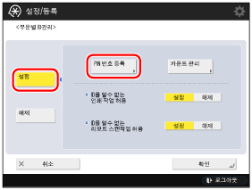 (설정/등록) → [관리 설정] → [사용자 관리] → [부문별 ID관리]를 누릅니다.