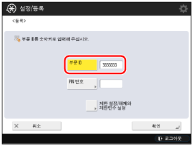 부문별 ID관리 기능을 시작하기 전에 부서 ID가 각 사용자의 사용자 정보에 설정되었는지 확인합니다. 부문별 ID관리 기능을 시작할 경우 부서 사용자 정보에 설정된 부서 ID가 없는 사용자는 로그인할 수 없습니다. |