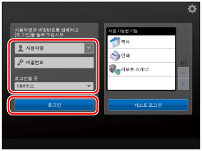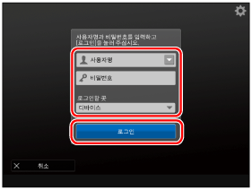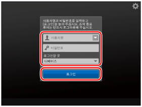 장치 제한 관리자의 사용자 이름 및 암호를 입력합니다. → [로그인할 곳]의 [이 디바이스]를 선택합니다. → [로그인]을 누릅니다.