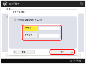 [PIN 번호]를 누릅니다. → [PIN 번호] 및 [확인입력]에 '0000003'을 입력합니다. → [확인]을 누릅니다.