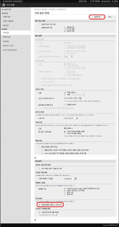 장치가 다시 시작되면 [프린터 드라이버 관리] 설정이 활성화됩니다. 장치 다시 시작에 관한 정보는 본 장치의 사용 설명서를 참조하십시오. |