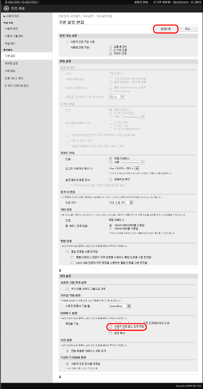 [제한할 기능]에서 적용한 설정을 활성화하려면 장치를 다시 시작해야 합니다. 장치 다시 시작에 대한 자세한 내용은 본 장치의 사용 설명서를 참조하십시오. (장치가 다시 시작된 후에 터치 패널 디스플레이에 초기화 완료 화면이 표시되면 화면의 지침을 따라 장치 전원을 껐다가 다시 켜십시오.) |
