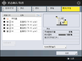 (状态确认/取消)时显示[状态确认/取消]屏幕。操作Access Management System时,无需登录设备即可在[状态确认/取消]屏幕上检查设备状态,但是无法检查复印和发送/接收状态。注释 |
