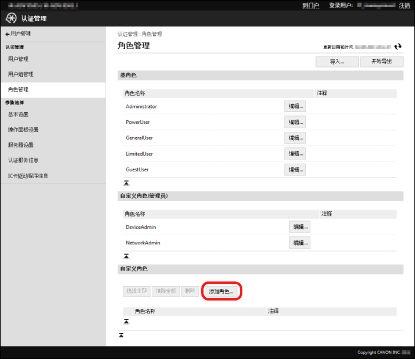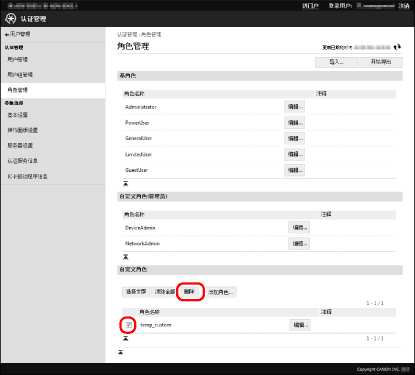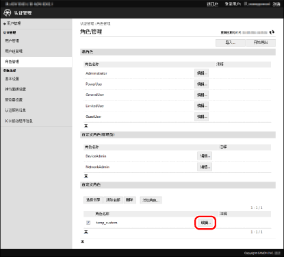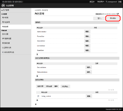 建议在编辑自定义角色后导出角色信息进行备份。有关详细信息,请参阅“导出角色”。 关联角色至[用户管理]屏幕上的用户。有关详细信息,请参阅设备的说明手册。 |