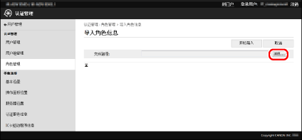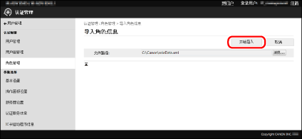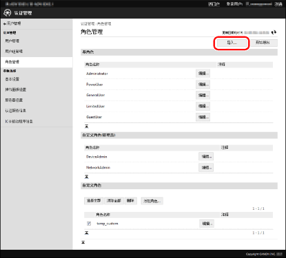 如果要导入角色的名称已存在,已有的角色会被导入角色信息覆盖。但是,对于来宾角色和自定义角色(管理员)以外的基角色,只覆盖注释。 如果[设备管理限制]设置无效(如果[设备设置]和[网络设置]设为[不允许]而[全部设置]设为[无限制]),则角色信息会被视为无效并无法导入。 如果设备中注册有导入文件未包含的角色,则这些角色不会被删除,且导入文件包含的角色会添加到设备中。 |