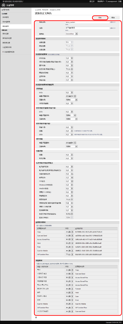 对基角色和自定义角色(管理员)仅可编辑[注释]。对[GuestUser]角色也可编辑限制信息。有关详细信息,请参阅“编辑[GuestUser]角色(来宾角色)”。 要更改自定义角色的角色名称,需删除该角色并作为新角色重新注册。 要更改[基角色]设置(从而更改设备管理权限),需删除该角色并重新注册。(也可导出该角色并通过在文本编辑器中对其进行编辑来更改[基角色]设置。不过在此过程中需注意不要编辑控制字符。) 更改的角色信息在下次登录时生效。对当前登录用户不会采用。 切勿对自定义角色设置比未注册用户(来宾角色)更严格的限制。如注册用户限制严于未注册用户,则登录后可使用功能会比登录前更少,或比[登录(来宾)]更少,这不利于用户管理。 |