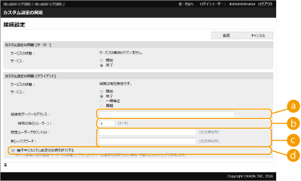 以下の場合には手順5 の入力をせずに同期設定をすることができます。 同期するデバイスが同一ルーター内にある場合 サーバー機の<ユーザー認証を使用>が<ON>(<ユーザー認証を使用>)、ログインサービスがUser Authentication(ログインサービスの変更について) クライアント機の[認証ユーザーアカウントID :]に何も入力されていない(null) カスタム設定の同期のサーバー機のサービスが[開始]されている(サーバー兼クライアント機の場合は、サーバーの[開始]とクライアントの開始を同時に指定して変更することができます。) 同一ネットワーク上に存在するカスタム設定の同期のサーバー機が1台である 次のような場合では、クライアント機は探索での接続ができません。接続先サーバーのアドレスにIPv4アドレスを入力してください。 サーバー機のネットワーク設定がIPv4/IPv6混在でかつ、IPv6を優先していて、クライアント機でIPv6を無効にしている場合 サーバー機のネットワーク設定に主回線を使用し、クライアント機のネットワーク設定に副回線を使用している場合 サーバー機のネットワーク設定に副回線を使用している場合は、次のように設定してください。 サーバー兼クライアント機:主回線のIPアドレスまたはlocalhostを接続先サーバーのアドレスに入力してください。 クライアント機:サーバー機の副回線のIPアドレスを接続先サーバーのアドレスに入力してください。 |