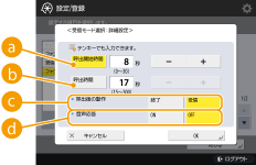 4 | <自動受信>または<FAX/TEL切替>を押し、必要な設定をする <自動受信>を選択した場合、<OK>を押す。 <FAX/TEL切替>を押した場合、<詳細設定>を押し、必要な設定をする ![]() <呼出開始時間>電話をうけてから呼び出し音を鳴らすまでの時間を設定します。 <呼出時間>呼び出し音を鳴らし続ける時間を設定します。 <呼出後の動作>呼び出し音を鳴らしても、こちらが電話に出ないときの本製品の動作を設定します。 <音声応答>音声応答メッセージを流す場合は<ON>を押します。