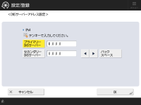 <認証設定>プロキシーサーバーの認証機能を使用するときに押して認証情報を設定します。表示される画面で<ON>を押し、プロキシー認証で使用するユーザー名とパスワードを入力したあと、<OK>を押します。