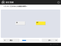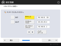 ネットワークに接続するための設定をします。 ![]() ![]() <IPv4を使用>または<IPv6を使用>の<ON>を押し、<次へ>を押します。IPv4/IPv6両方を使用することもできます。 <IPv4を使用>と<IPv6を使用>を<OFF>にして<OK>を押すと、ネットワークの設定を行わずにStep 10へ進みます。 ![]() <IPv4を使用>を<ON>にした場合は、次の設定を行います。 ![]() IPアドレスを自動で取得する場合は、<DHCP>または<Auto IP>を押し、<次へ>または<OK>を押します。 IPアドレスを手動で設定する場合は、<DHCP>または<Auto IP>の選択を解除して、<IPアドレス>、<サブネットマスク>、<ゲートウェイアドレス>を押してそれぞれ入力し、<次へ>または<OK>を押します。 IPv4アドレスの設定について詳しくは、IPv4アドレスを設定するを参照してください。 ![]() <IPv6を使用>を<ON>にした場合は、次の設定を行います。 ![]() ステートレスアドレスを使用する場合は<ON>/使用しない場合は<OFF>を押し、<次へ>を押します。 IPv6アドレスの設定について詳しくは、IPv6アドレスを設定するを参照してください。 ![]() ステートレスアドレスを設定したあと、次の設定を行います。 ![]() 手動アドレスを使用する場合は<ON>/使用しない場合は<OFF>を押し、<次へ>を押します。 手動アドレスを使用する場合は、<手動アドレス>、<プレフィックス長>、<デフォルトルーターアドレス>を押してそれぞれ入力します。 ![]() 手動アドレスを設定したあと、次の設定を行います。 ![]() DHCPv6を使用する場合は<ON>/使用しない場合は<OFF>を押し、<OK>を押します。 | |