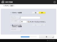 プロキシーを使用する場合に必要な設定をします。 ![]() ![]() プロキシーを使用する場合は<ON>を押し、<サーバーアドレス>、<ポート番号>を押してそれぞれ入力し、<OK>を押します。 <同一ドメインにもプロキシーを使用>を<ON>にした場合は、<認証設定>を押してプロキシー認証の設定をします。 プロキシーの設定について詳しくは、プロキシーを設定するを参照してください。 | |