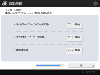ネットワークユーザーリスト、ファクスユーザーデータリスト、調整値リストをプリントできます。 ![]() ![]() 出力したいレポートの<プリント開始>を押すと、リストがプリントされます。 リストのプリント完了後やリストをプリントしないときは、<OK>を押します。 | |